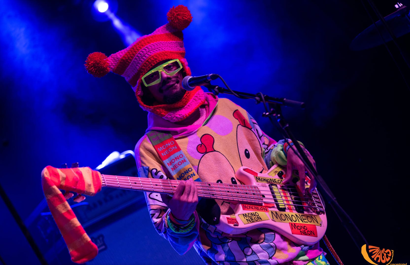 Last night I was introduced to my favorite drummer I’ve ever seen live, Daru Jones, and an absurd-in-more-ways-than-one bassist, MonoNeon. MonoNeon wears… unique outfits but I guess that’s what happens when you hang out with Prince too much. He plays a right-handed five-string bass left-handed, but totally upside down, with his thumb on the high strings. And he’s very good at it.